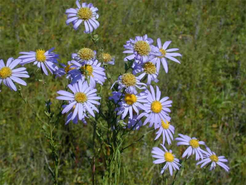 Семейство Астровые До 60 см выс. Корзинки жёлтые с бледно-синими краевыми язычковыми цветками, напоминающими лепестки, до 5 см диам., собраны в щитковидное соцветие. Листья линейные, острые, на одиночных прямых стеблях. Цветение: июль–сентябрь. Местообитания: луга, степи, залежи.