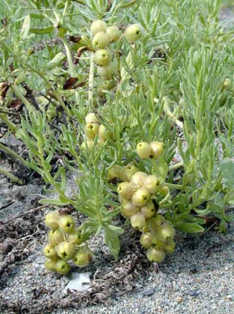Семейство Бурачниковые До 25 см выс. Цветки до 1 см диам., с 5 белыми лепестками, собраны в щитковидном соцветии. Плоды шаровидные, твёрдые. Листья сидячие, линейные. Стебли раскидисто-ветвистые, при основании древеснеющие. Цветение: май–июль. Местообитания: солончаки, берега солёных озёр.