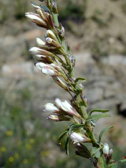 Семейство Бобовые До 50 см выс. Цветки желтоватые или белые, верхний лепесток (парус) с фиолетовыми полосками, в коротких, малоцветковых, пазушных кистях. Листья тройчатые, с удлинёнными цельнокрайними листочками. Бобы до 4 см дл., ланцетно-продолговатые. Цветение: июль–август. Местообитания: степи, каменистые склоны, заросли степных кустарников.