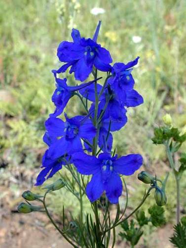 Семейство Лютиковые До 70 см выс. Цветки в широких кистях, ярко-синие или сине-фиолетовые, до 3 см диам., неправильной формы, с тонким, прямым шпорцем. Листья рассечены на узкие линейные доли. Стебли прямые, ветвистые, прижато опушённые. Цветение: июнь–август. Местообитания: степи, каменистые склоны, залежи.